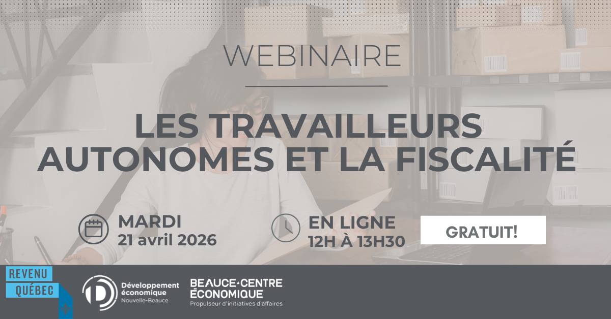 DENB, en collaboration avec Revenu Québec et Beauce‑Centre Économique, vous invite à participer à cette séance d’information portant sur les travailleuses et travailleurs autonomes et la fiscalité, et à bénéficier d’explications claires en direct.